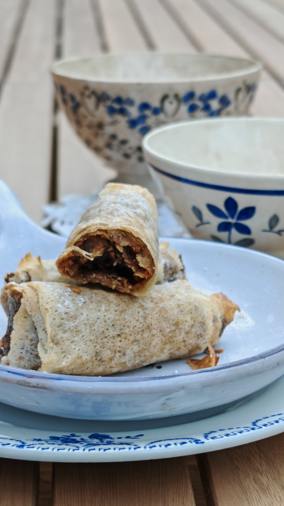 Progression : Préchauffez le four à 180° C. Faites fondre le beurre. Broyez cacahuètes et noix. Mélangez beurre, amandes effilées, cacahuètes, noix, sucre de canne et chicorée liquide. Coupez les feuilles de brick en deux. Vaporisez un peu d’eau sur les 2 moitiés. Déposez un petit tas de pâte aux amandes en bas d’une moitié de feuille. Rabattez les côtés de la feuille vers le centre et roulez-la jusqu’en haut en serrant bien. Déposez sur une feuille de papier-cuisson sur une plaque de cuisson et faites toutes les feuilles de la même façon. Enfournez 20 minutes.
