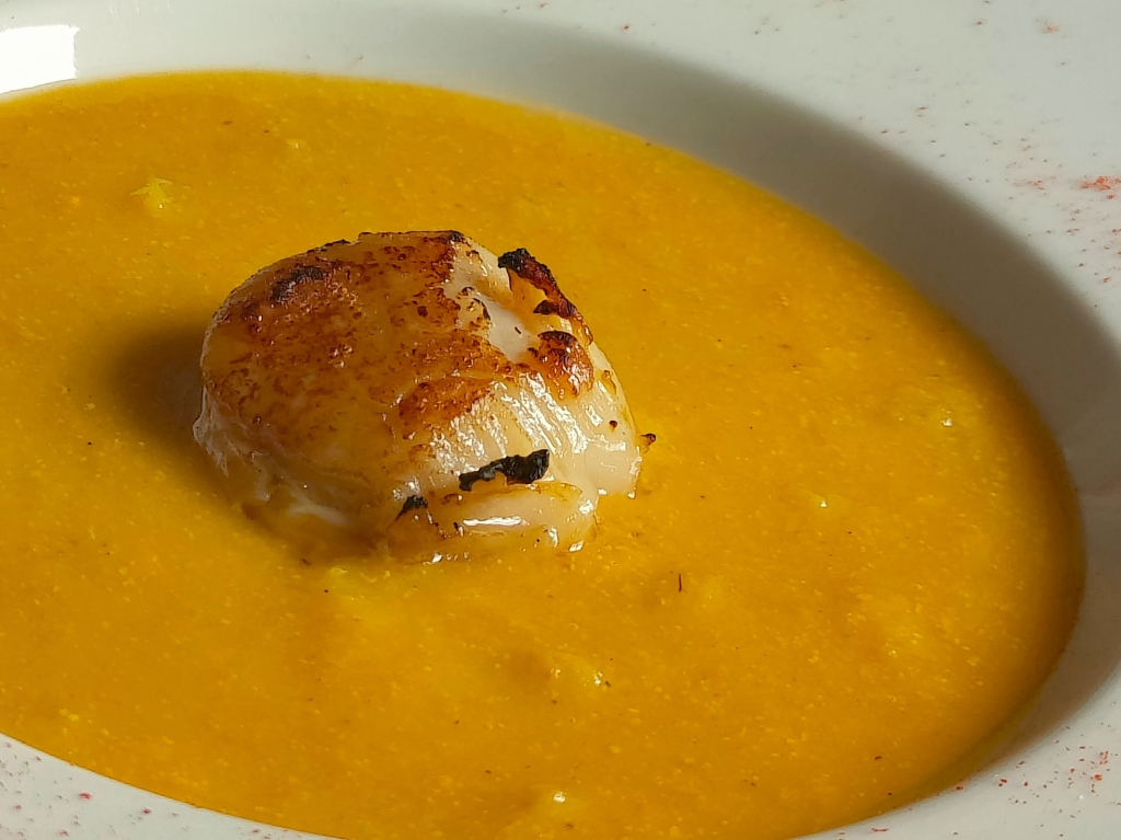 Nettoyez les Saint-Jacques, séparez les noix du reste. Mettez 6 noix de côté. Lavez le reste (avec ou sans le corail, c’est affaire de goût) et faites-le bouillir dans 80 cl d’eau non salée. Filtrez. Farinez les 12 noix, faites-les sauter dans un faitout, dans un peu de beurre. Ajoutez l’oignon pelé et ciselé, le persil plat effeuillé, la patate douce pelée et coupée en petits morceaux et le vin blanc sec. Mouillez avec l’eau et faites cuire 30 minutes. Mixez finement, ajoutez une bonne pincée de piment d’Espelette. Au moment de servir, faites sauter les noix réservées. Assaisonnez, servez la soupe et répartissez les noix sur les assiettes.