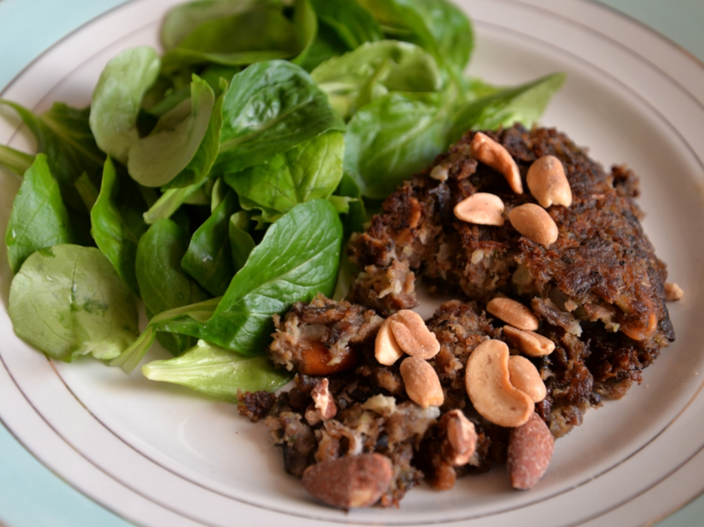Progression : Mixez le bœuf bouilli. Pelez et ciselez l’oignon. Mélangez bœuf, oignon, champignons lavés et coupés, 1 œuf, raisins secs, cacahuètes broyées, persil et ail ciselés, sel et poivre. Formez 12 boulettes et aplatissez-les en galets. Passez-les dans un peu de farine et dans le second œuf que vous battez. Ensuite passez-les dans la chapelure. Faites chauffer un peu de matière grasse dans une poêle et faites revenir les galets à feu doux en les retournant régulièrement pendant 30 minutes.