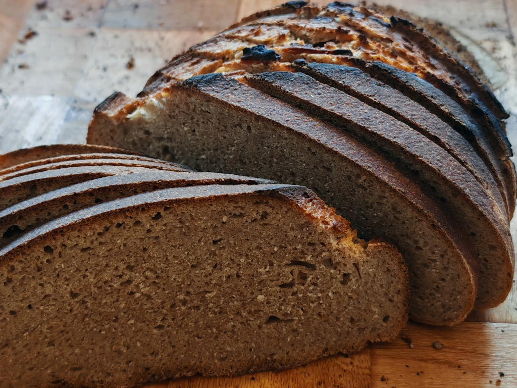 100 g de levain liquide, 300 g d’eau tiède, 350 g de farine de seigle bio t130, 150 g de farine de blé bio t65, 10 g de sel