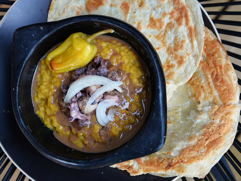 Dressage : Servez les lentilles et les calamars en sauce avec du riz et/ou des naans ou des parathas.