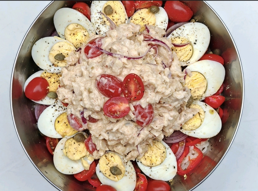 Faites une jolie présentation en disposant câpres, œufs écalés, tomates, poivrons et oignons.