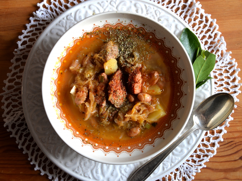 250 g de haricots coco secs trempés 24 h, 3 oignons, laurier, marjolaine, saindoux, 1 poireau, 10 baies de genièvre écrasées, 3 gousses d’ail, 6 pommes de terre, 500 g de choucroute nature, sel, poivre, 3 saucisses fumées, paprika fumé